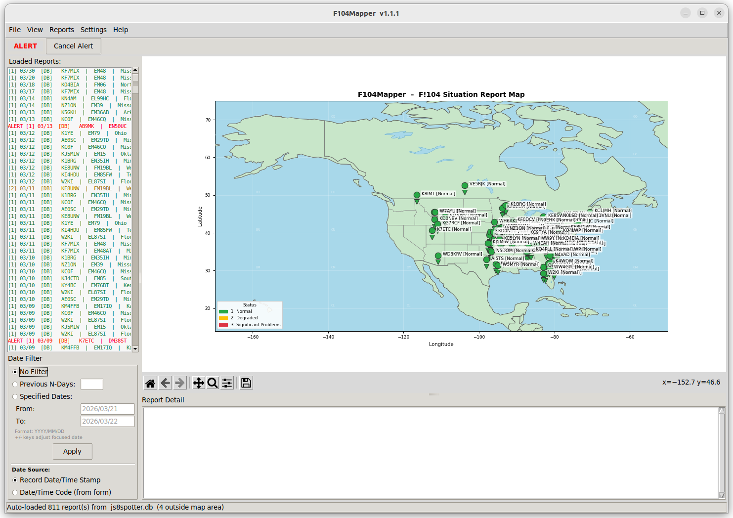F104Mapper is a companion program to JS8Spotter. It reads F!104 Situation Report form data received via JS8Call / JS8Spotter and displays that data on an offline map of North America, allowing operators to quickly see the operational status at each reporting station’s location.
